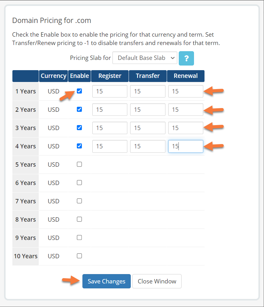 First, tick the check box beneath the Enable column in order to allow customers to register a domain for that period of time.