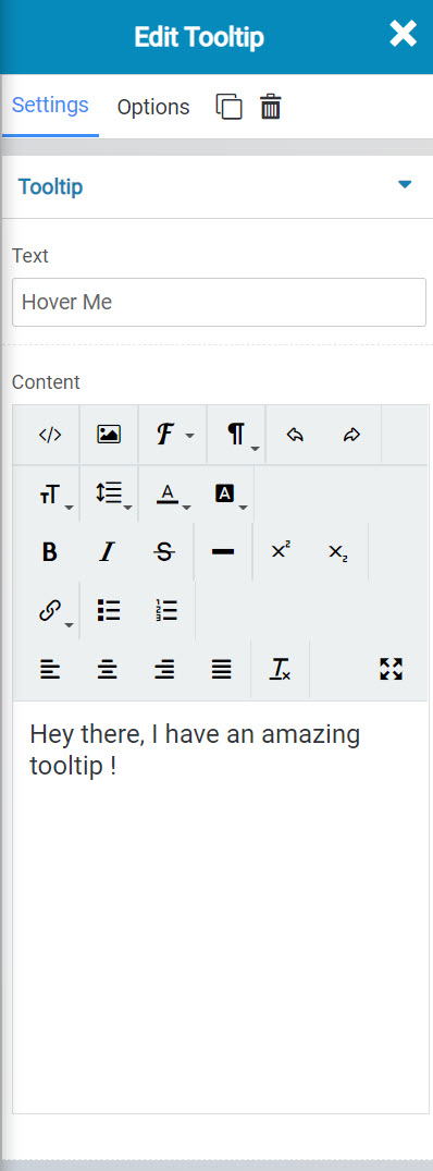 - At the very bottom is the text editor where you will enter the text that shows when the tooltip is activated (when the user hovers over the text).