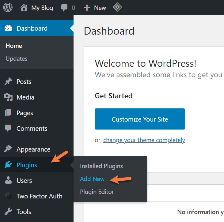 Step 1: Login to your /wp-admin and using the menu on the left, hover over Plugins and in the little menu that expands, click Add New.
