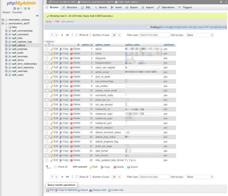Your table prefix may vary, however, your table names will still be the same, so you’ll want to click the one that ends in _options in your phpMyAdmin.
