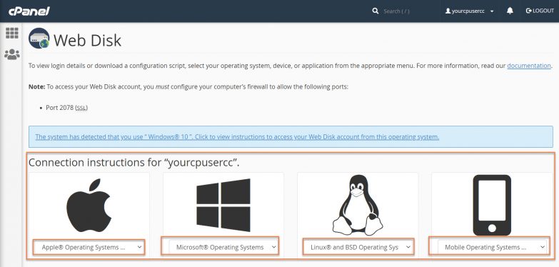 cPanel also includes Client Configuration Instructions for the native WebDAV integration available in macOS, Windows, Linux & BSD OS’, and Mobile OS such as iOS and Android.