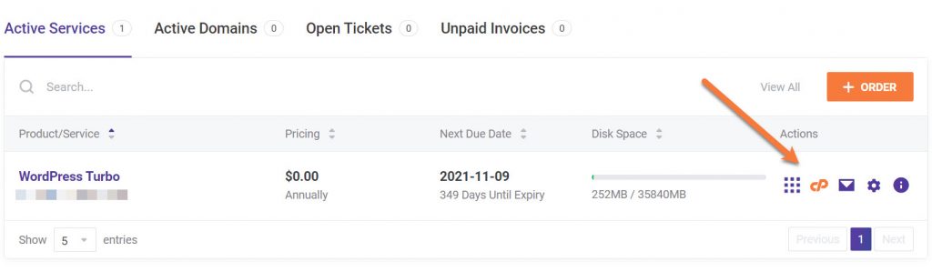 We’ll be using the cPanel File Manager to create the file. First, open your Client Area to login to your Client Portal. Then, locate the orange CP icon to the right of the service you want to administer.