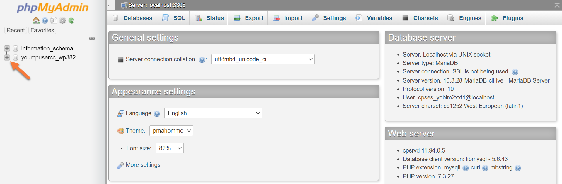 Step 3: Once phpMyAdmin is open, look for your database on the left side and click the + to expand the list of tables within the database.