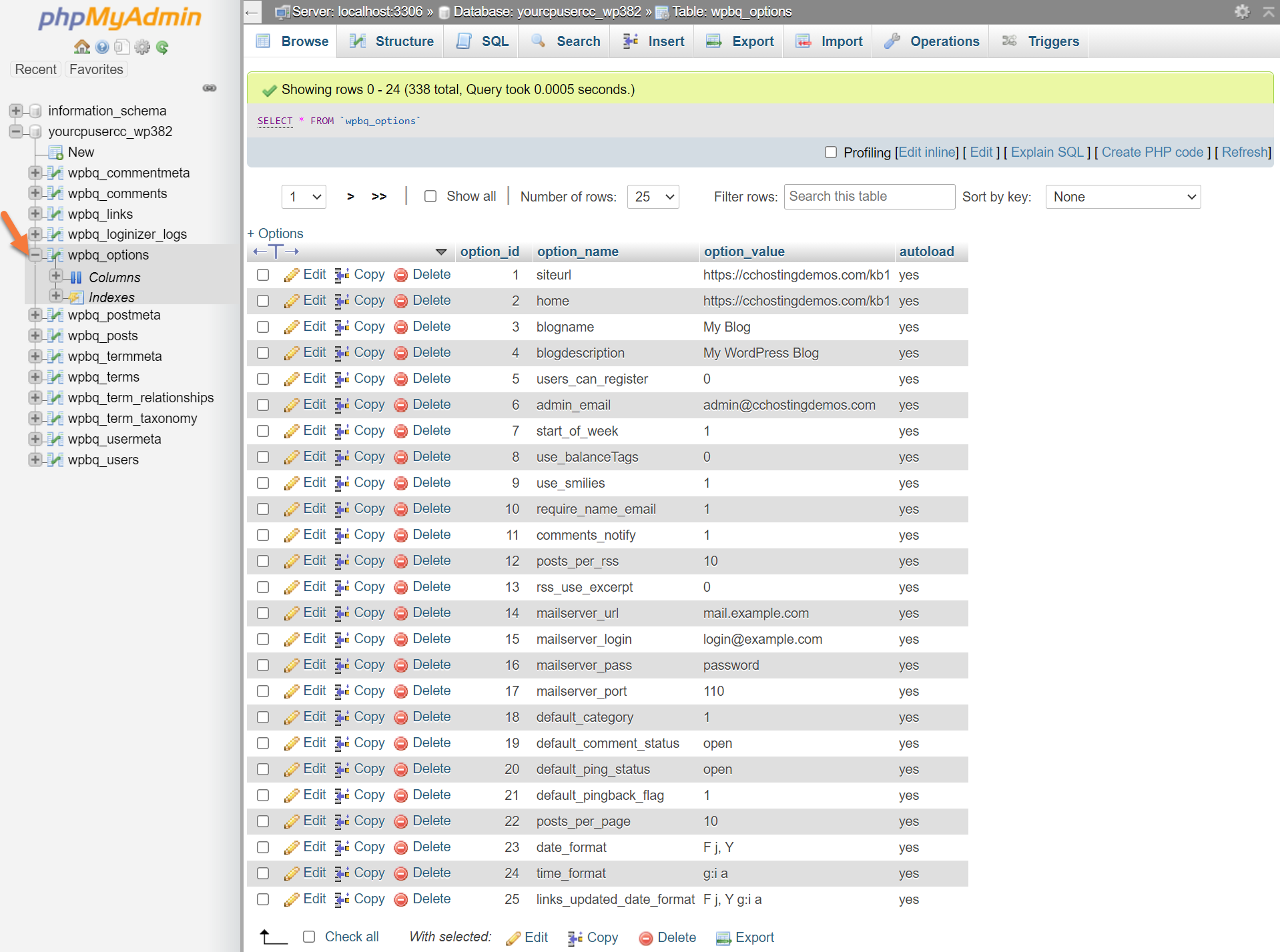 Step 4: The table in which plugin data is stored is always in _options. Click the table name to open it in phpMyAdmin on the right side.