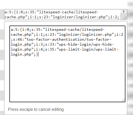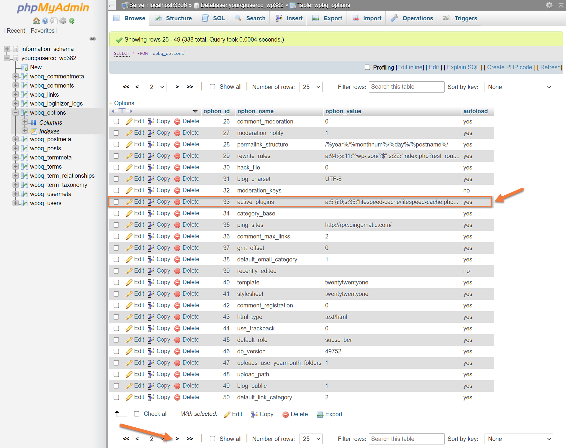 Step 5: Use the pagination feature to go to page 2 of your database where you should see the option_name is active_plugins.