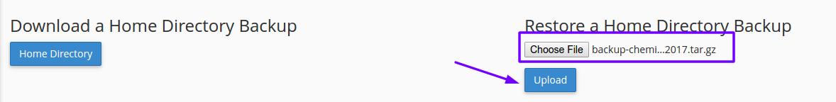3) In the “Partial Backup” section, click the “Choose File” button located under “Restore a Home Directory Backup” select the backup file you intend to use from your PC and click “Open”.