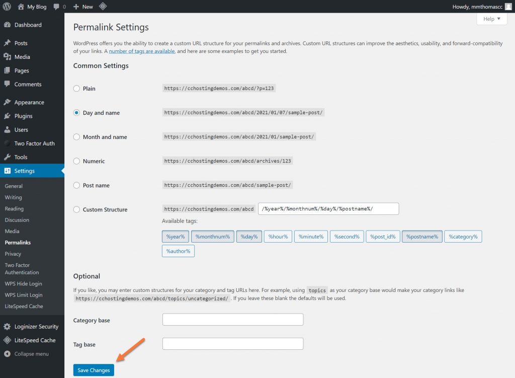 Once your Permalinks page has opened, click the blue Save Changes button at the bottom.