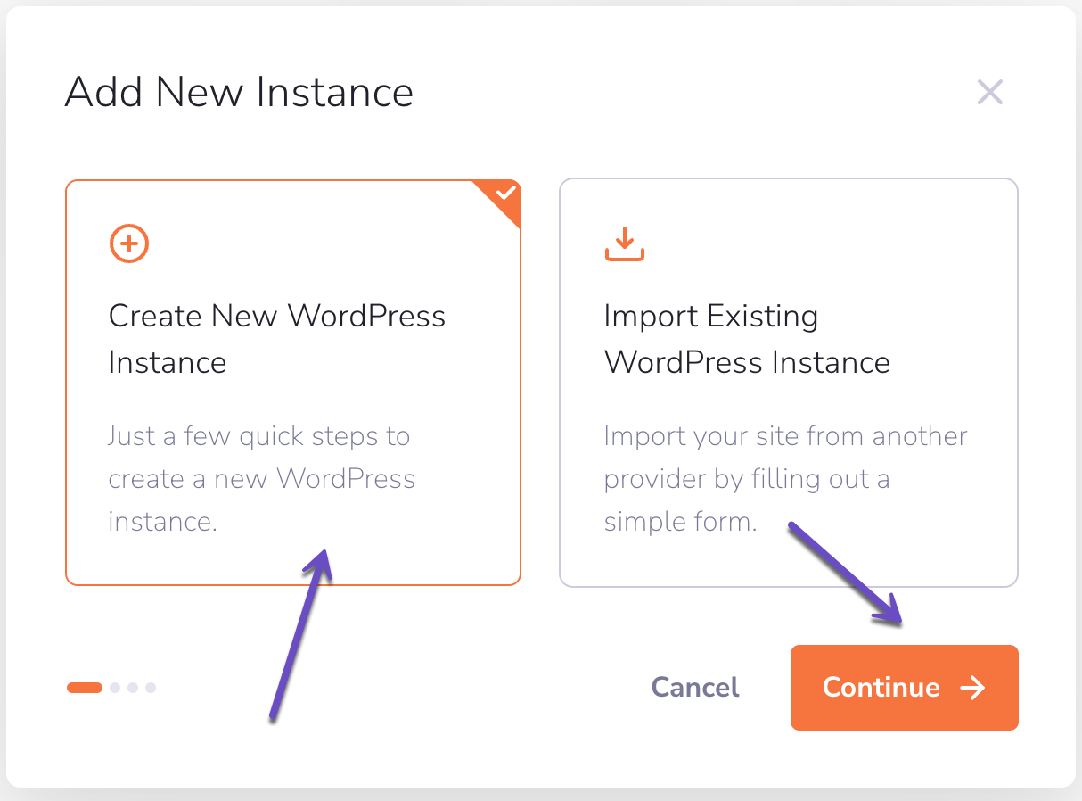 You’ll be prompted to either create a new WordPress instance or import one from another provider.