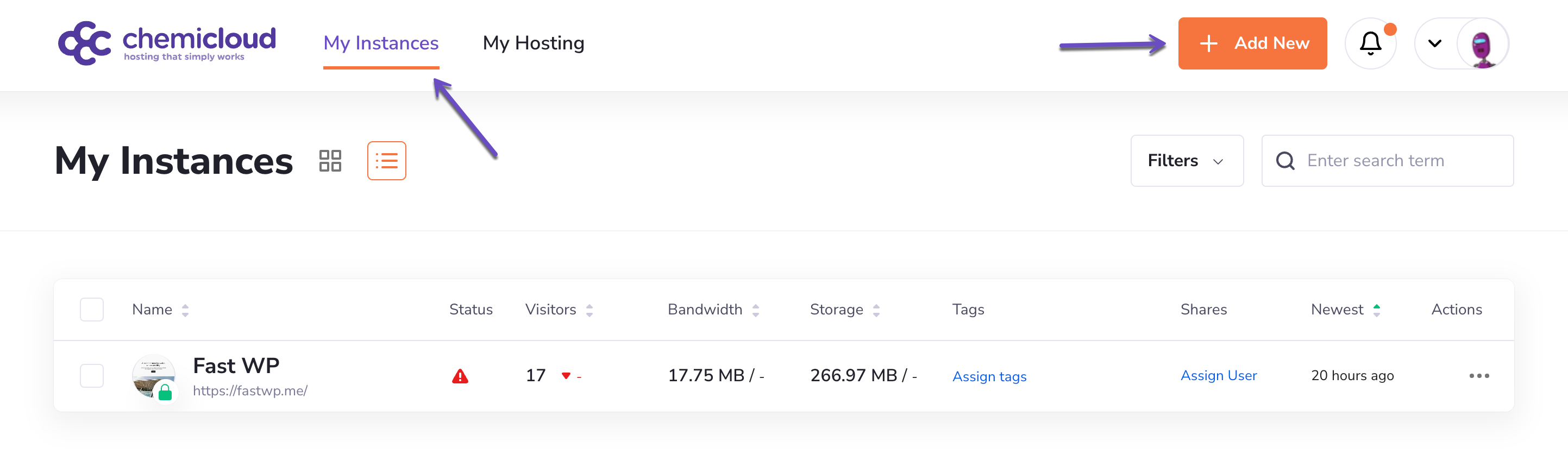 2. Go to My Instances > click + Add New to create a new WordPress instance.