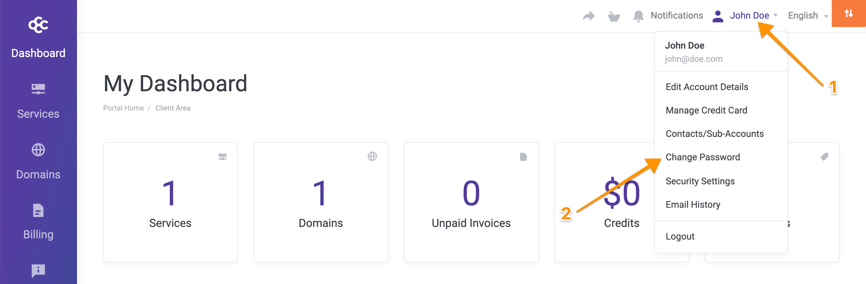 2) Once you are logged in, click on the account name in the top header (right-hand side) then click on Change Password in the sub-menu. As in the screenshot below: