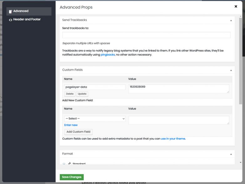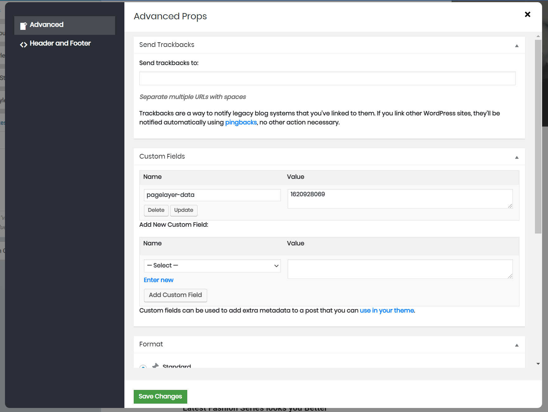 The Advanced Section allows you to control settings such as your trackbacks, custom fields, and post format.