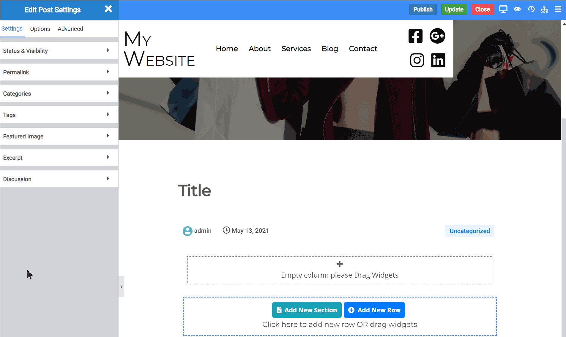 You can build your Blog Post out by dragging a Title, Rich Text, and any other widgets you need from the widgets area into the area that says “Empty column, please drag widgets”.
