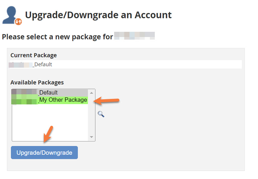 Step 5: You will be taken to the Packages area of WHM, where you will be able to choose a different package for this account.