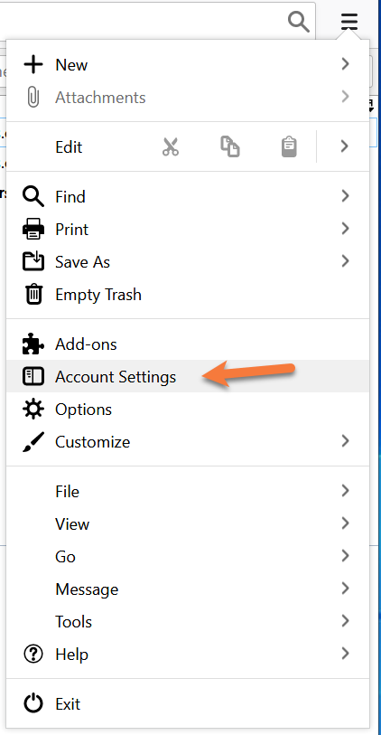 To add a new account, click the ≡ icon (hamburger menu) in the top right corner of Thunderbird below the X to close the application.