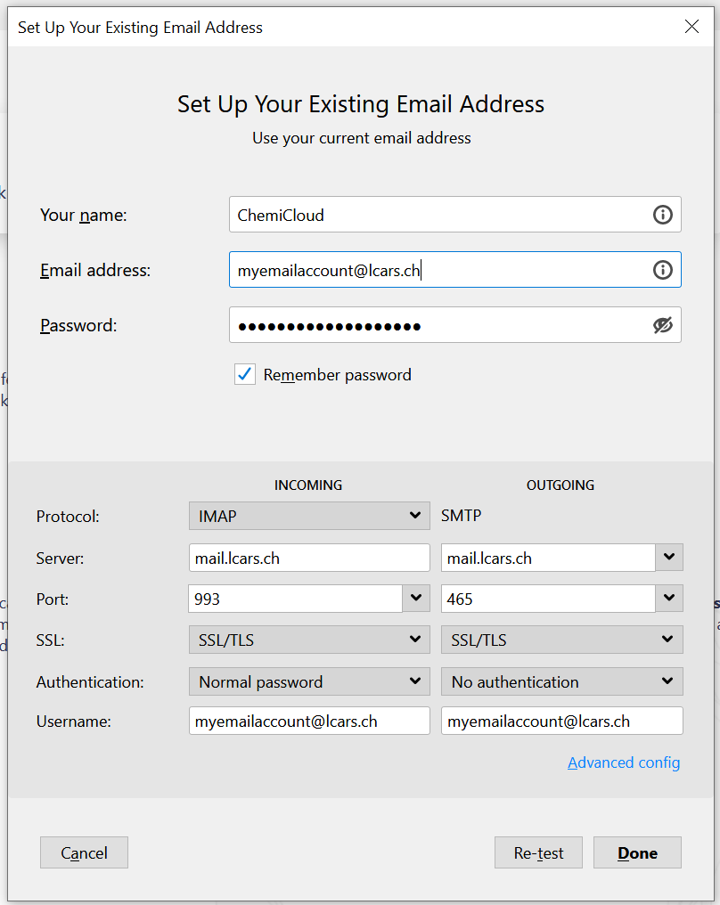 When you’ve finished, click Done. Thunderbird will perform a connection test to validate the server information + username and password you have provided in the configuration are correct.