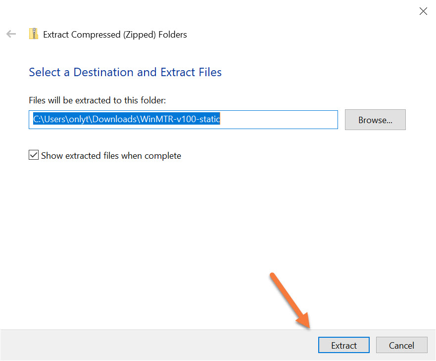 Next, click “Extract” to extract the files into the same folder where the WinMTR ZIP was saved.