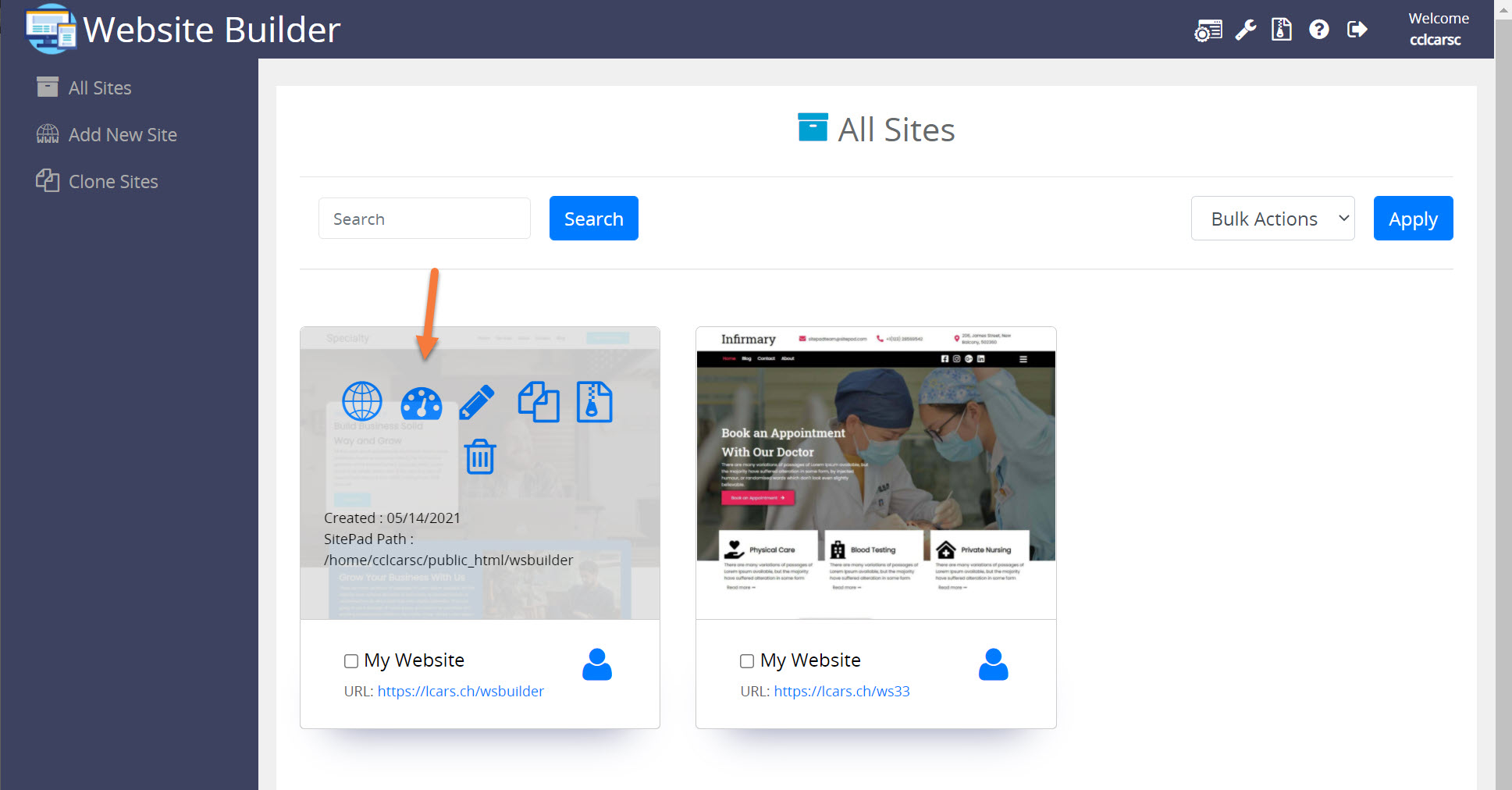 Step 3: Your list of sites will load. Locate the site edit, then hover over that site and click the speedometer icon to login to the site of your choosing: