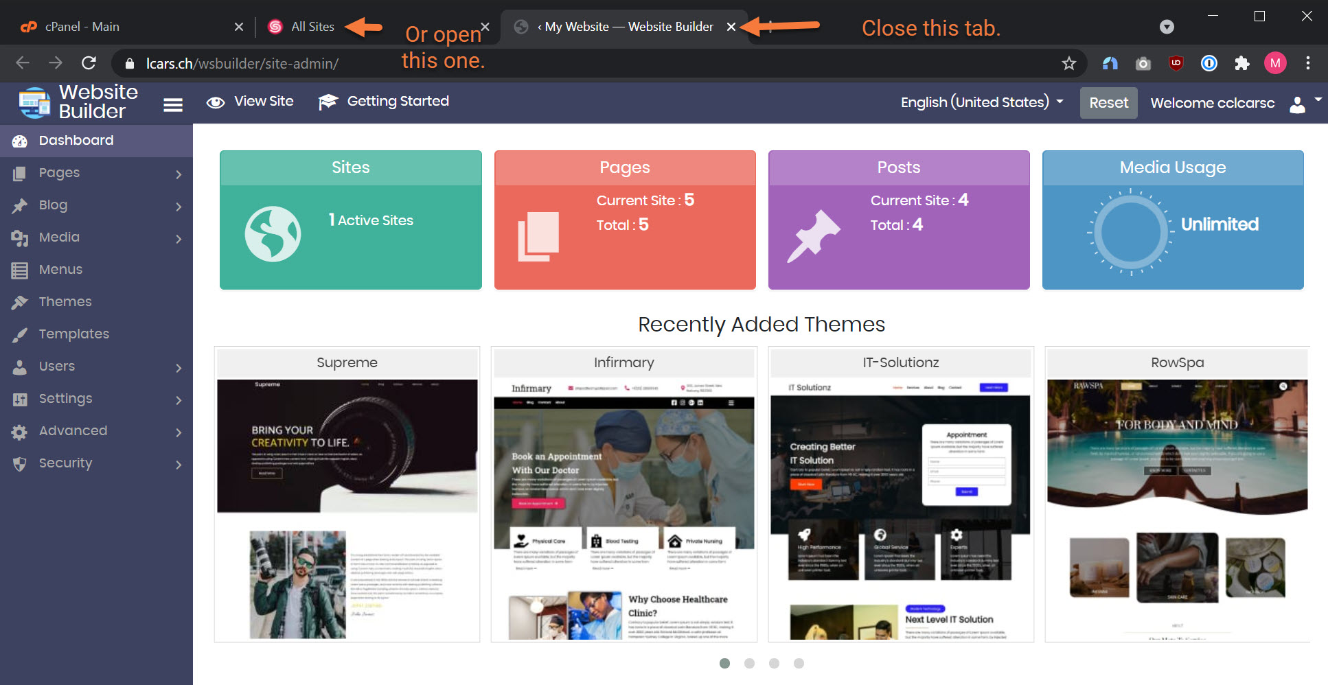 Step 4: To switch to the other site, close the tab that opened in the browser and return to the All Sites tab, or just leave the Website Builder Admin for the first site open, and click the All Sites tab.