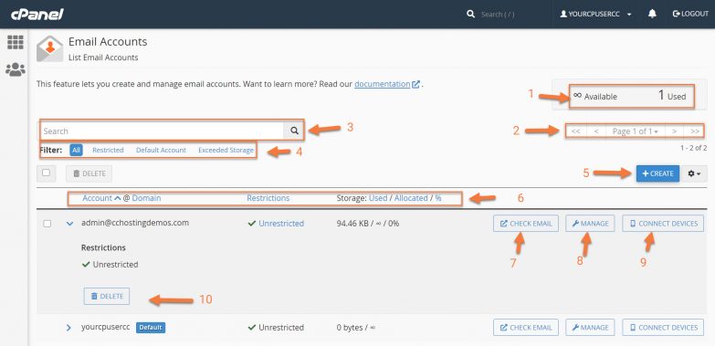 - This indicates the number of email addresses our cPanel account can create and how many we have created. The default account is permanently excluded from this count.