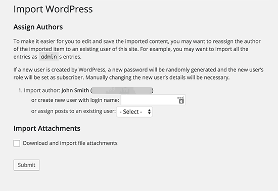 If all goes well with the import, which it should, then you will see an import settings screen where you’ll need to choose an author name for the imported content. WordPress can also import the Squarespace users and add them as subscribers on your WordPress site. You can also choose an existing admin user as author or even create a new user.