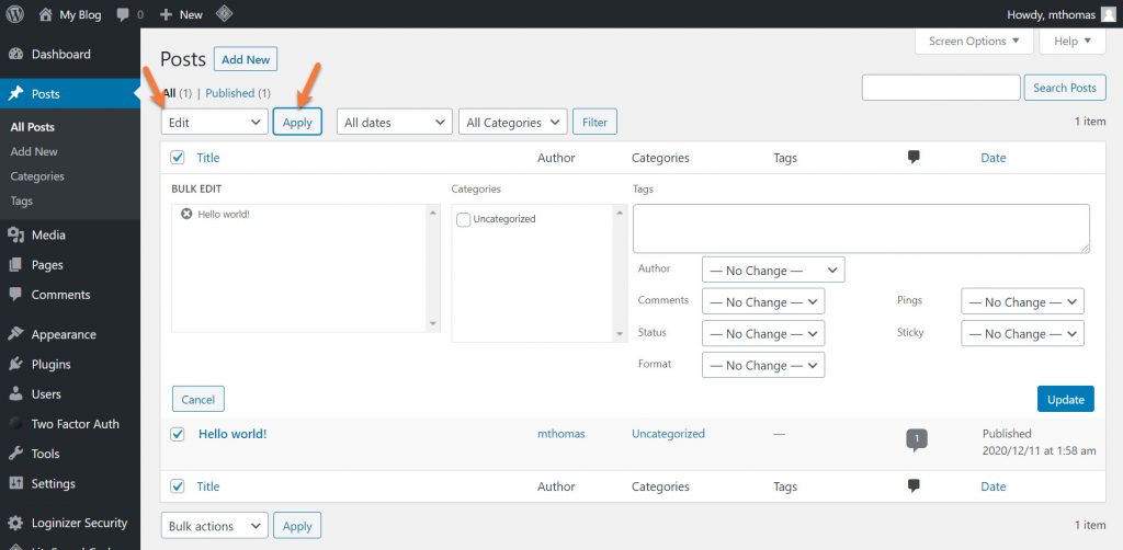 Next, click the Bulk actions menu, and click Edit. Then click Apply.