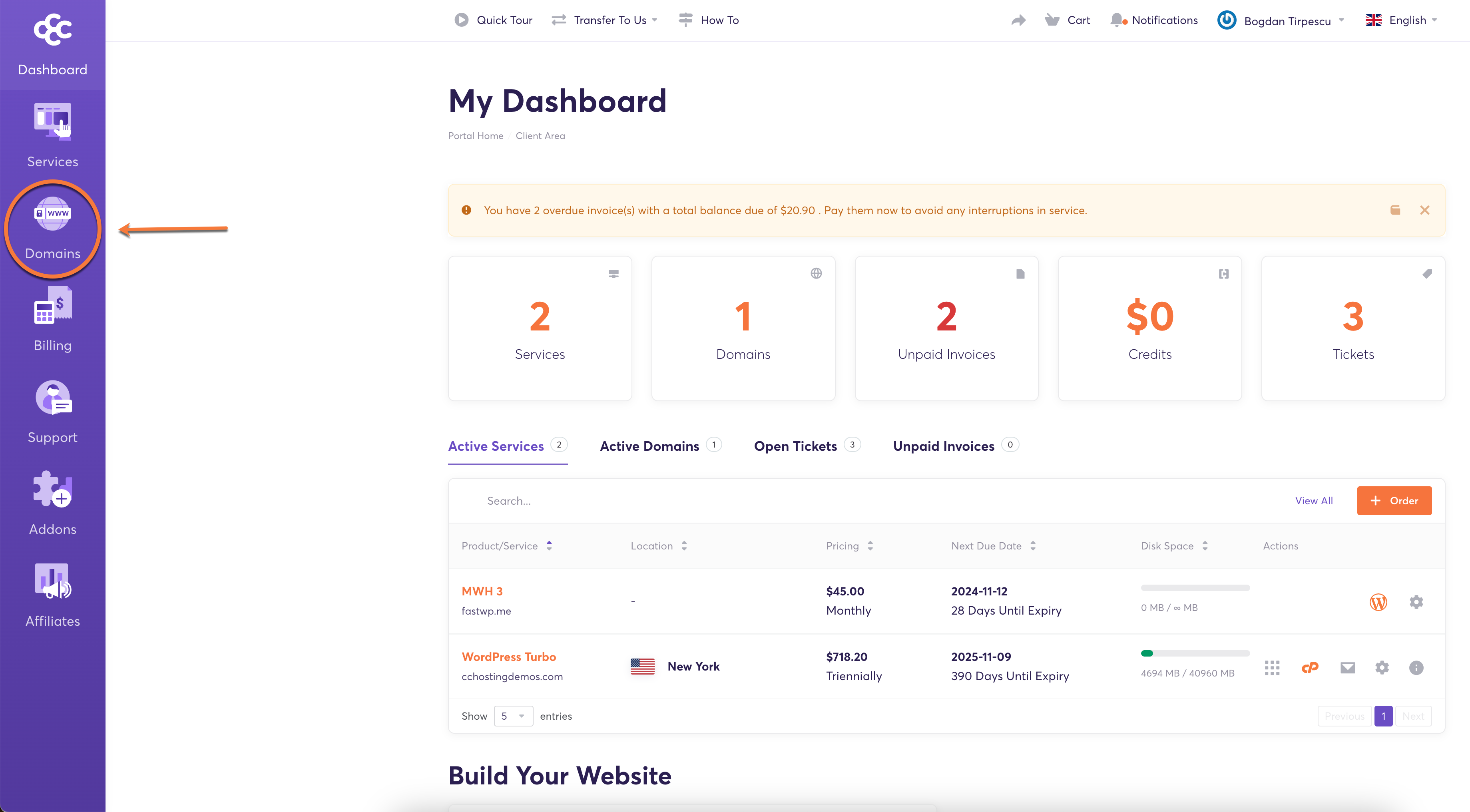 Step 2: In your Client Area Dashboard, click the “Domains” icon located on the left-hand side menu.