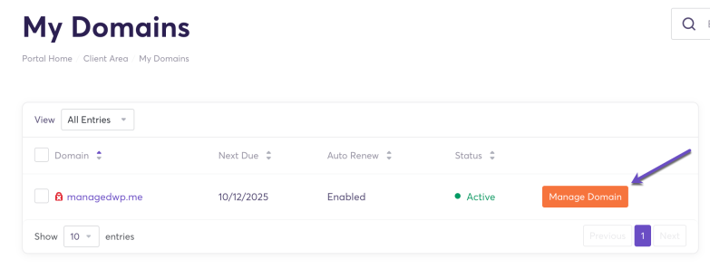 Step 3: From the list, locate the domain you want to manage and click the “Manage Domain” button.