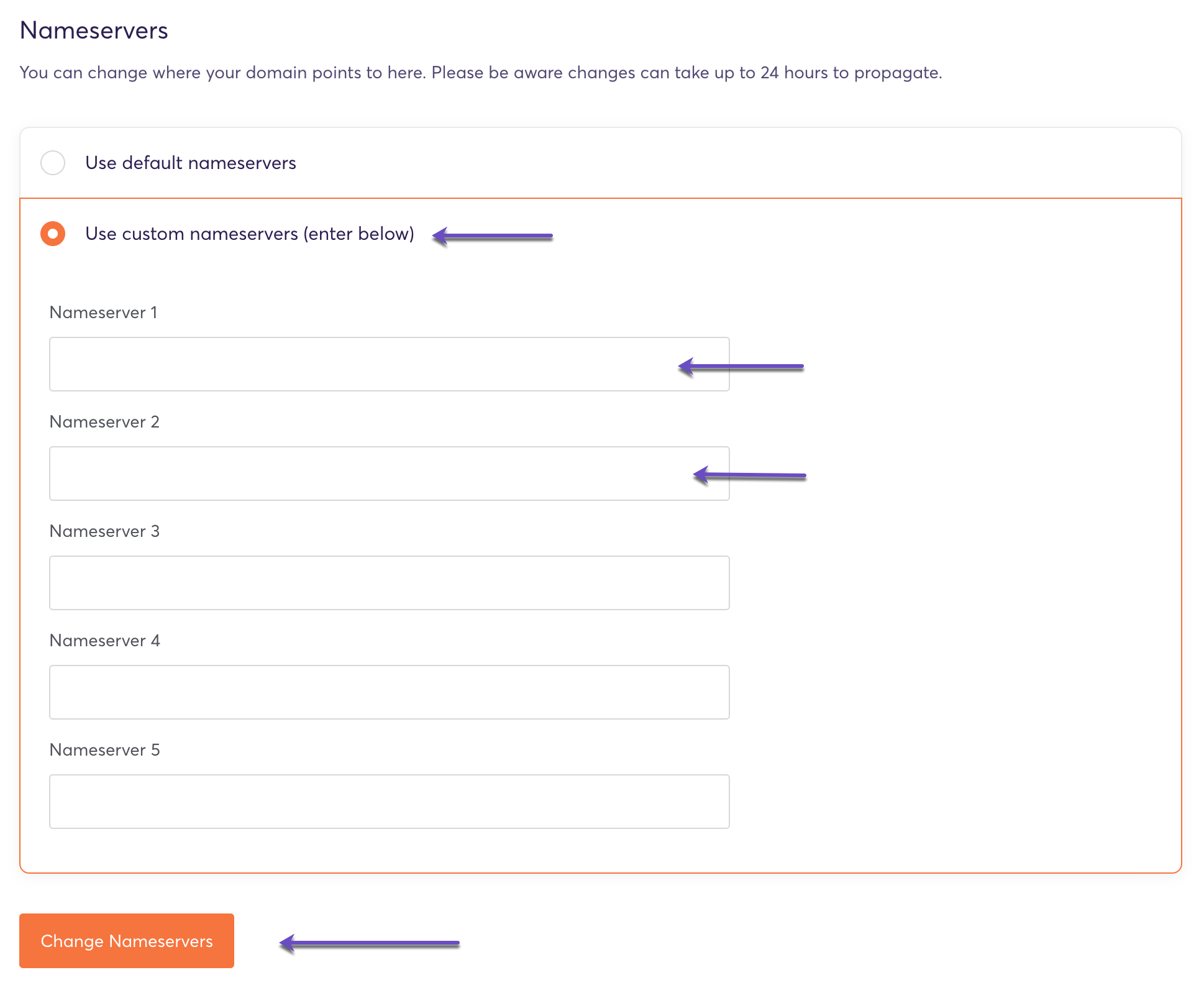 Step 5: Select the “Use custom nameservers” option and enter the nameservers you wish to use for your domain.