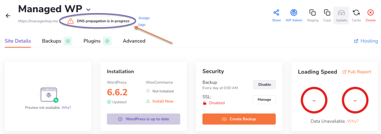 If your domain is not pointing at the Cloudflare nameservers, you should see a “DNS propagation is in progress” message in the top section.