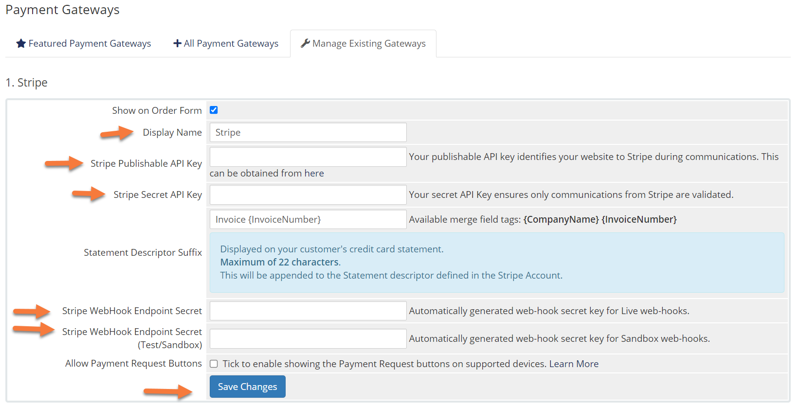Step 3: You will be taken to the Stripe configuration where you can enter your Stripe API keys.