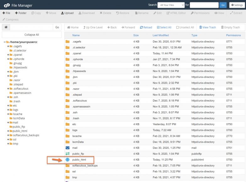 Step 2: When the file manager is open, double click the globe icon next to the public_html folder to open the folder.