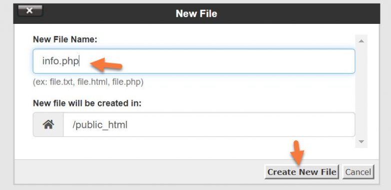 A modal will appear where you can give the file a name. Enter info.php and click Create a new file.