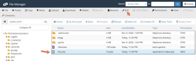 Step 4: After the file is created, single-click the file in the directory listing, then click Edit at the top: