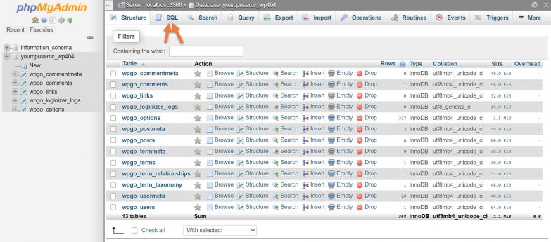 Step 4: After opening the database, click the SQL button at the top of phpMyAdmin.