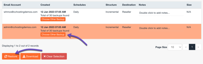 Step 4: After clicking Email accounts, you will be given a list of available email accounts backups. In my example, I’m going to restore an email account called “[email protected]” from the latest backup, so I will choose the backup at the top by clicking on it.