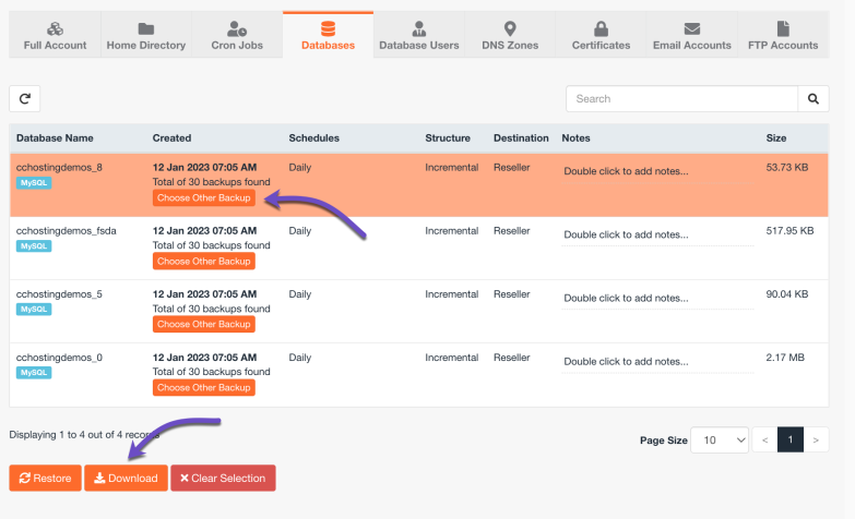 Step 4: After clicking Databases, you will be given a list of available database backups. In my example, I’m going to restore a database called “cchostingdemos_8” from the latest backup, so I will choose the backup at the top by clicking on it. If you’re using WordPress, here’s a helpful guide on how to find the name of your WordPress database.