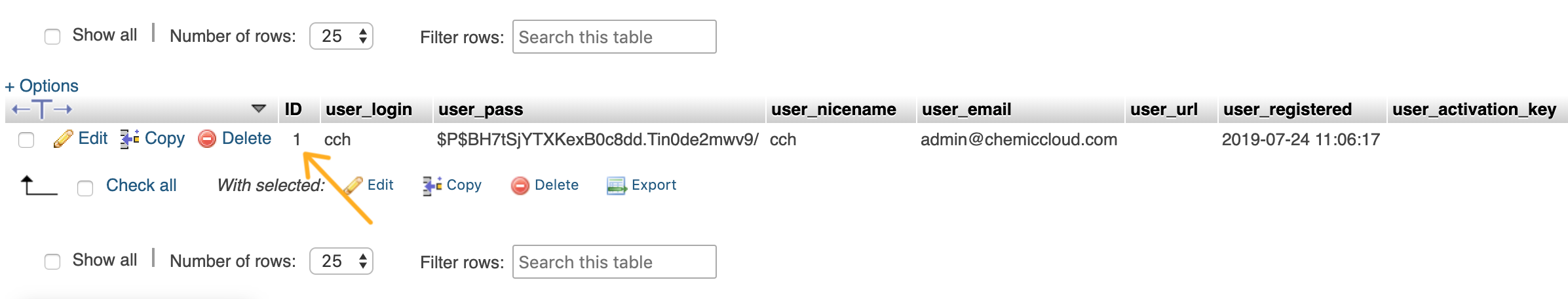 2) Once you’ll open the wp_users table, you will see a list with the existing usernames which are created on your WordPress site. Locate the username that you were using to log in as an admin and look up after the ID. In our case, the ID is “1” as can be seen in the screenshot below.